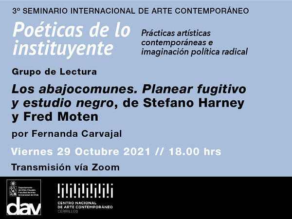 Este seminario contempla una serie de actividades que se desarrollarán entre los días 3 al 5 de noviembre en formato híbrido: virtual y presencial (programación completa en Adjuntos). Previo a esto el Departamento de Artes Visuales de la Facultad de Artes de la Universidad de Chile ha organizado distintos grupos de lecturas en torno a temas y autora/es que estarán presentes en este encuentro, los que se desarrollarán este viernes 29 de octubre de forma virtual a través de zoom.
