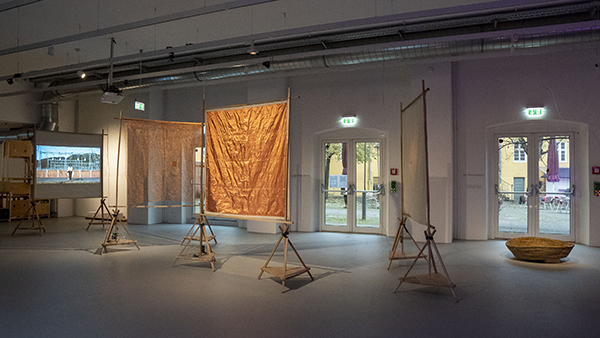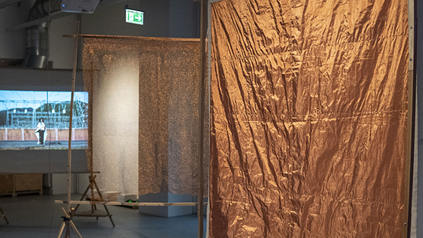 Esta última consiste en una instalación de piezas textiles de cobre (tejido, costura y bordado) que dan forma a dispositivos tecnológicos y desarrollan funciones específicas, como capturar frecuencias del campo electromagnético, emitir sonidos y bloquear señales electromagnéticas.