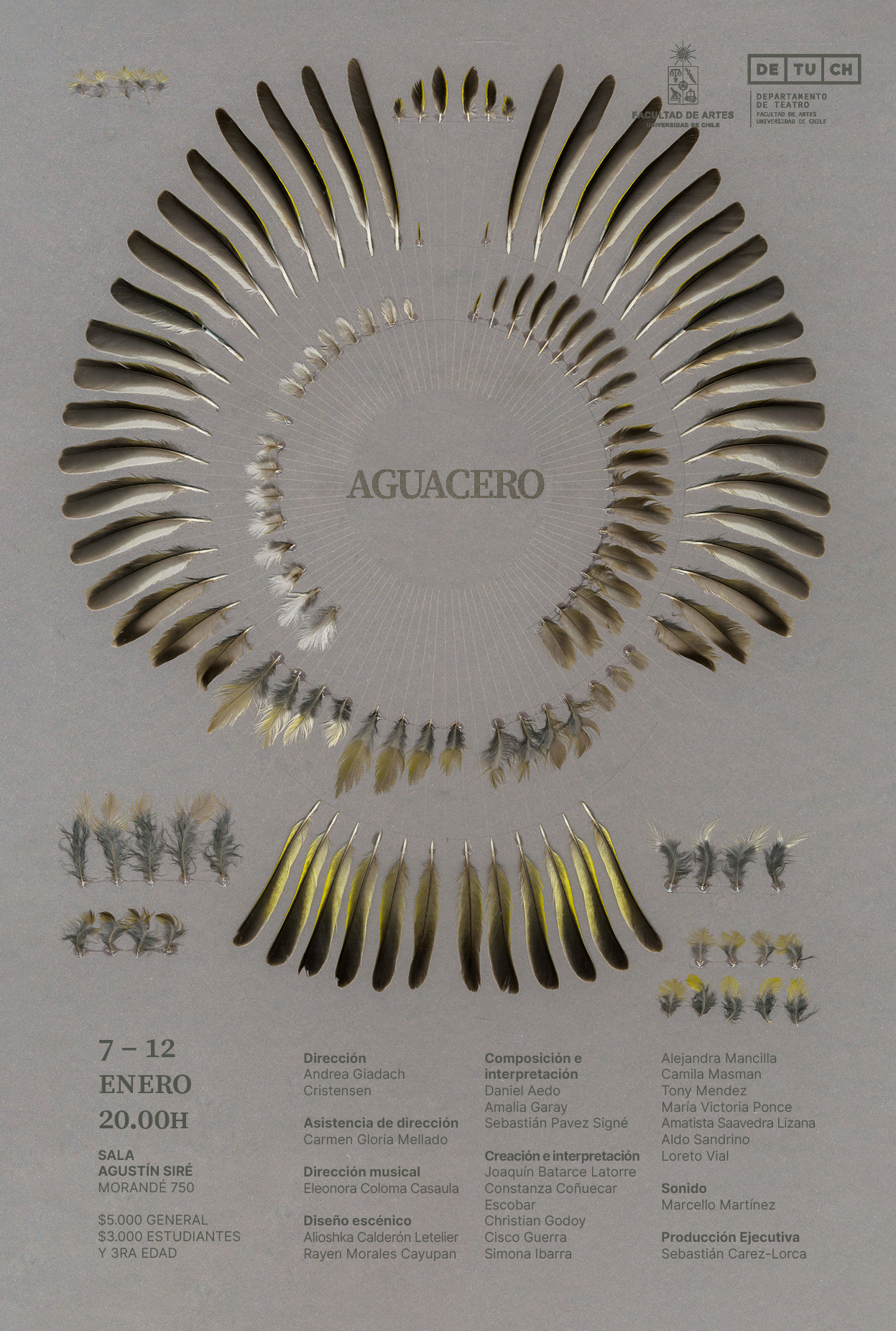Este 2022 el Departamento de Teatro de la Universidad de Chile inicia su cartelera teatral en la Sala Agustín Siré con el montaje Aguacero, entre el 7 y el 12 de enero. Dirigida por Andrea Giadach, el montaje se construye en base a los textos “Aguacero de Mayo” y “La ciudad de la fruta” de Leyla Selman; completándose con manifiestos biográficos del equipo.