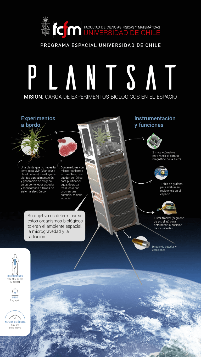 En su interior viajará una tillandsia o clavel del aire, planta que no necesita tierra para sobrevivir, pero que funciona como análoga a plantas que pueden ser relevantes en el espacio, tanto como alimento como para producir oxígeno. Su contenedor, especialmente fabricado para mantener a la planta viva y medir su condición, permitirá determinar si ésta tolera el ambiente espacial, la microgravedad y la radiación. Con el mismo objetivo, serán enviados cuatro contenedores más pequeños con microorganismos extremófilos que viven en zonas extremas de Chile y que pueden tener aplicaciones en el espacio, como purificadores de agua, por ejemplo, la degradación de residuos y la lixiviación, para una potencial minería espacial.