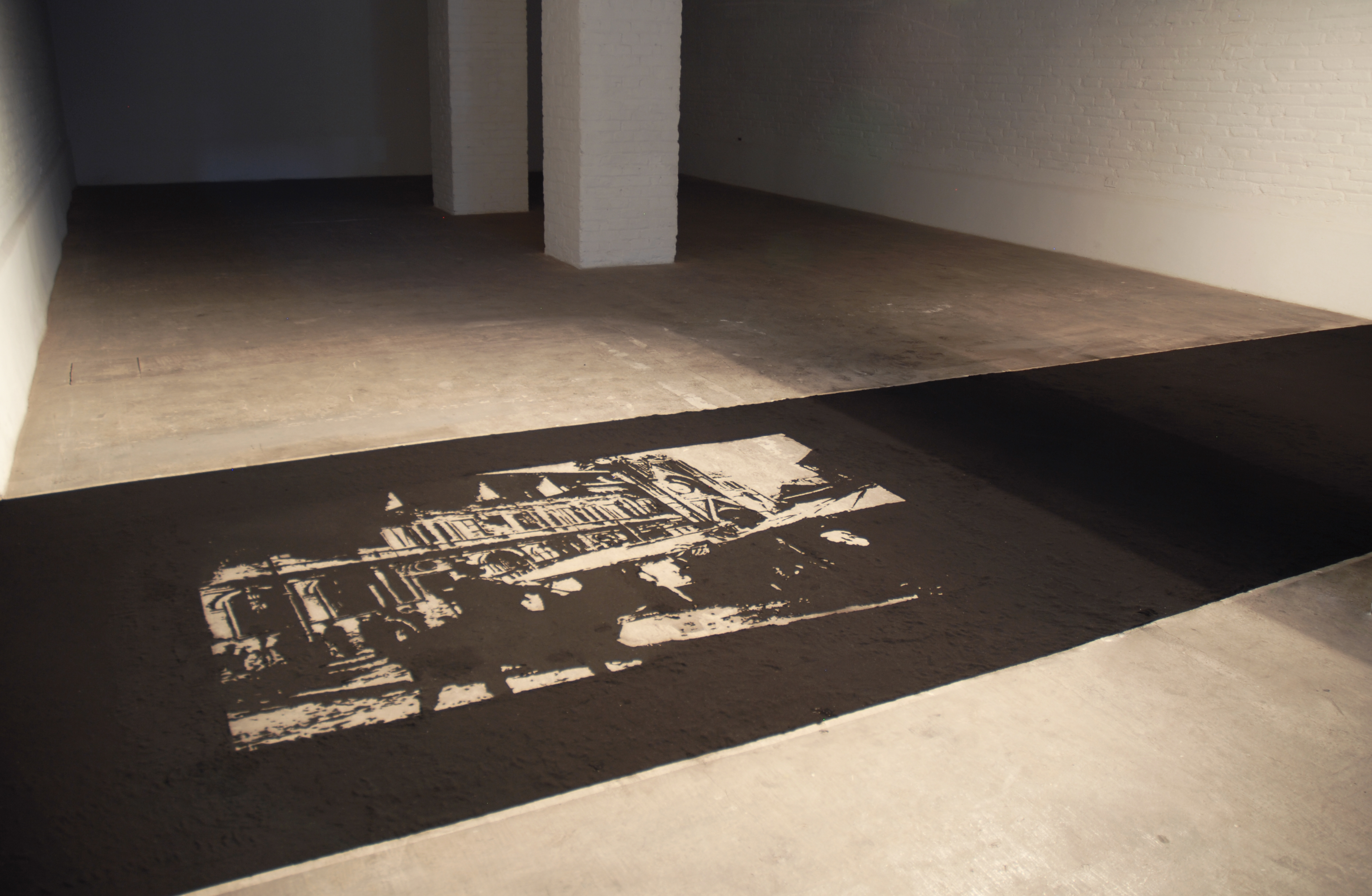 Rodrigo Bruna, Pulvis et Umbra (2013). Instalación, tierra de color negra y stencil, dimensiones variables; Sala Puntángeles, Valparaíso. Créditos fotos: © Rodrigo Bruna
