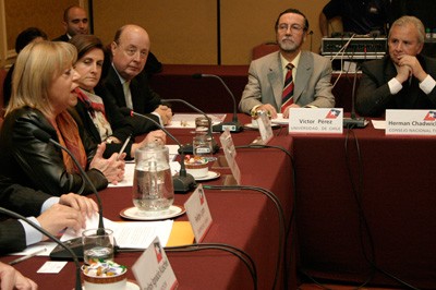 | El jurado del Premio a lo Chileno, mientras deliberaba el galardón. Al fondo, el Rector Víctor Pérez. |