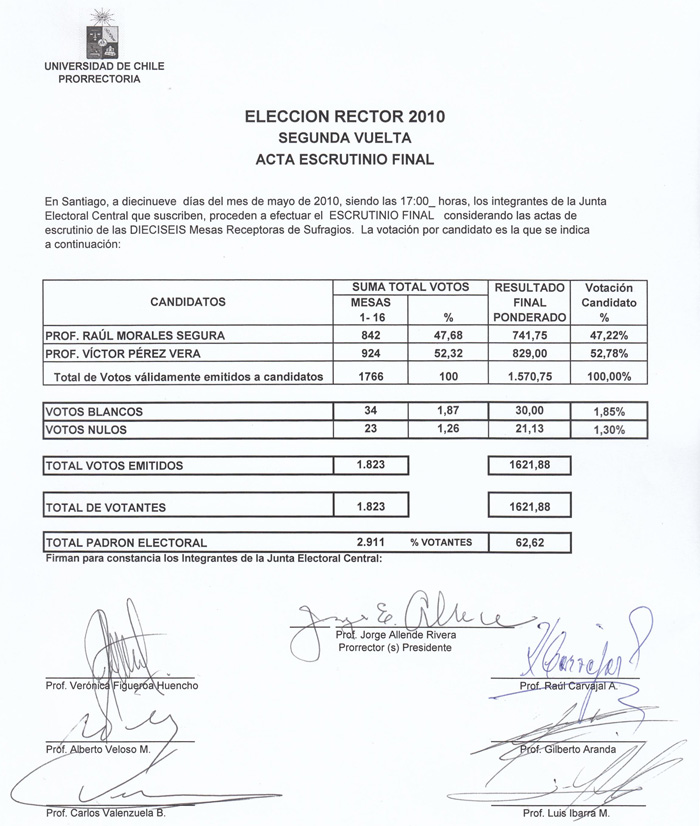 Al cierre de la segunda vuelta, tanto los académicos que apoyaban a los profesores Pérez Vera como a Morales Segura, se reunieron para escuchar la entrega oficial de los resultados de la elección de Rector, en la voz del Presidente de la Junta Electoral Central, Dr. Jorge Allende (ver detalles en el archivo pdf adjunto).