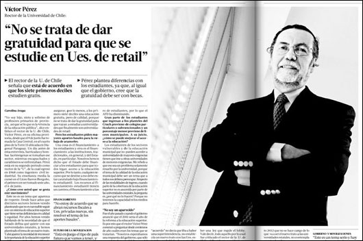 "Yo soy hijo, nieto y sobrino de profesores primarios de provincia, así que sé lo que es la vivencia de la educación pública", dice enfático el rector de la U. de Chile, Víctor Pérez, en su oficina provisoria, desde que el 9 de junio fue tomada la Casa Central, en el cuarto piso de la Torre 15 ubicada en Diagonal Paraguay. Un día antes de esta entrevista, barricadas y bombas lacrimógenas se tomaban ese sector, mientras encapuchados y carabineros se enfrentaban. Pérez está en su segundo período como rector de la "U", de la cual egresó en 1968 como ingeniero civil industrial. Su enseñanza media la cursó en el Liceo Barros Borgoño, el primero en ser tomado este año, el 6 de junio.