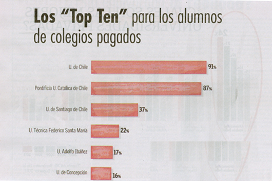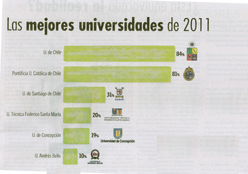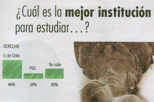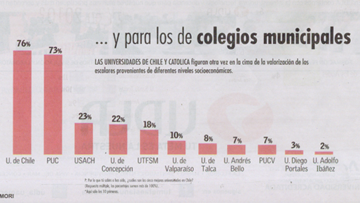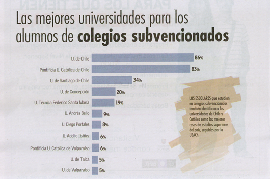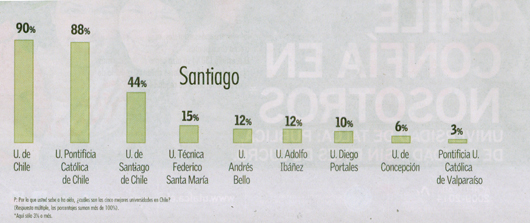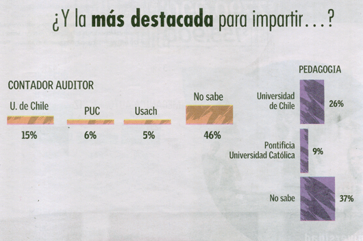 Por otra parte, el estudio escogió 12 carreras universitarias para que los escolares seleccionaran cuál era la mejor Universidad para estudiarlas. La Universidad de Chile fue escogida en primer lugar en las carreras de Derecho (46%), Ingeniería Civil (32%), Ingeniería Comercial (26%), Contador Auditor (15%), Pedagogía (26%) y Enfermería (21%).