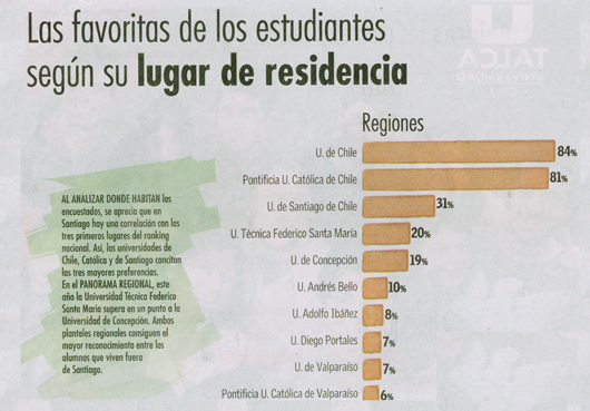 Nuestra Casa de Estudios fue elegida por los estudiantes de la Región Metropolitana como la favorita para seguir sus estudios superiores con un 84%, seguida por la Pontificia Universidad Católica de Chile con un 81%. En tercer lugar se ubicó la Universidad de Santiago de Chile con un 31%.