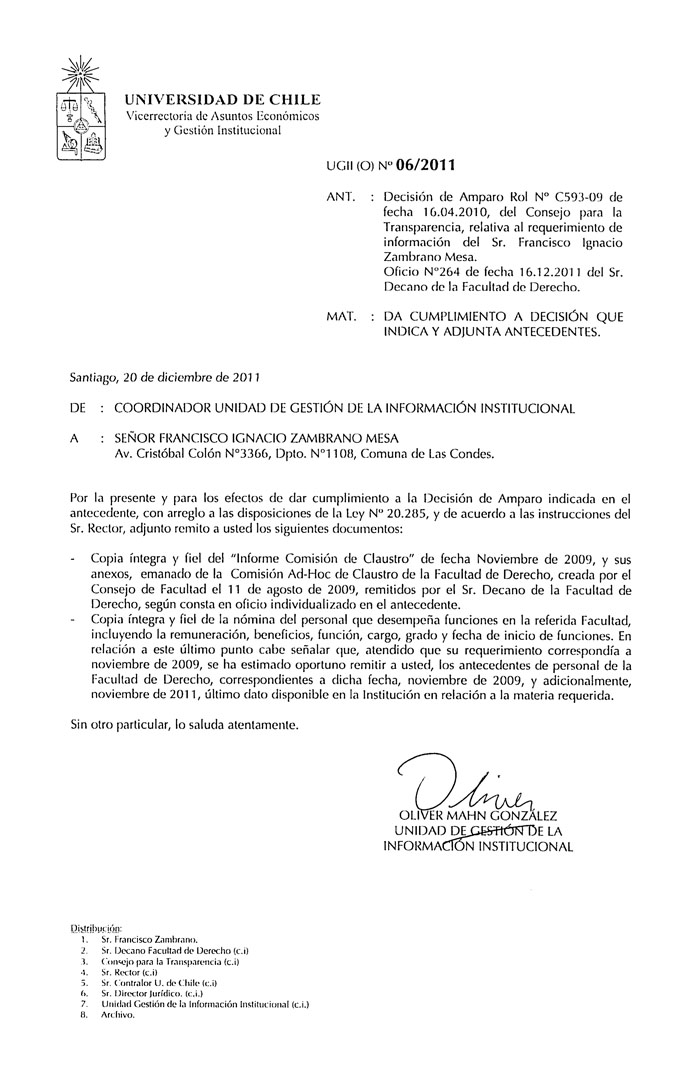 Como es de público conocimiento, ya se impartieron las instrucciones pertinentes para que, dentro de los plazos establecidos y a la brevedad posible, la Universidad de Chile complemente la información publicada en el sitio web institucional relativa a transparencia activa, en los términos señalados en el artículo 7° de la Ley N° 20.285, especialmente los antecedentes relativos a la planta del personal y el personal a contrata y a honorarios, con las correspondientes remuneraciones.