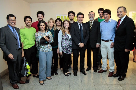 Representantes de Comisiones de Campus Sustentables de la U. de Chile junto al Rector, Víctor Pérez Vera; el Vicerrector de Asuntos Académicos, Patricio Aceituno; el Ministro de Medio Ambiente (S), Ricardo Irarrázaval; y el Director Ejecutivo del Consejo Nacional de Producción Limpia -dependiente del Ministerio de Economía-, Jorge Alé.
