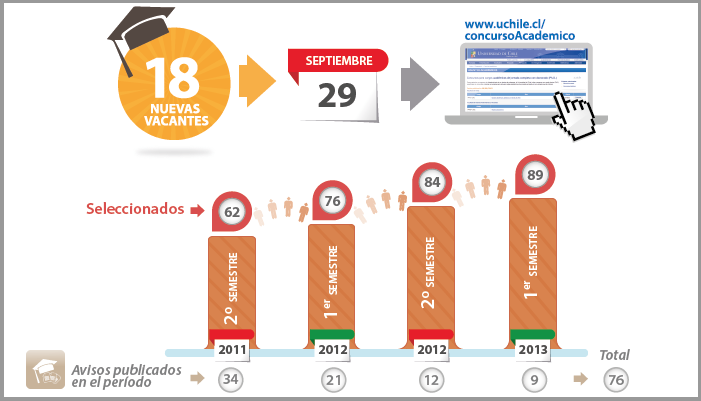 18 nuevas vacantes para académicos de excelencia están disponibles desde el pasado 29 de septiembre  a través de la plataforma de Concurso Académico, sistema  que está vigente desde noviembre del año 2011 y contribuye a un procedimiento riguroso, público, abierto y transparente en la selección de los nuevos académicos de la Universidad de Chile.