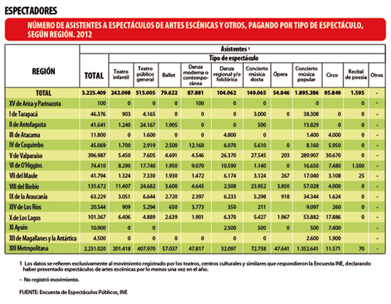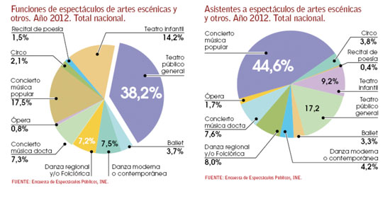 Una suerte de barómetro del comportamiento de los públicos respecto a las manifestaciones artísticas y el estado de éstas a nivel país son los resultados del Informe Anual de Cultura y Tiempo Libre, estudio realizado por el Instituto Nacional de Estadísticas (INE) y el Consejo Nacional de la Cultura y las Artes (CNCA). En su más reciente entrega, ocurrida en Diciembre de 2013, el informe arrojó cifras que en términos generales pueden considerarse positivas, ya que salvo algunas excepciones, los índices de asistencia a las distintas manifestaciones crecieron.