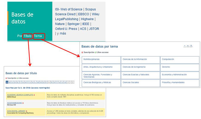 2. En la portada, se encuentra el acceso directo a las Bases de datos más relevantes y a continuación las opciones Por: Título | Tema:
