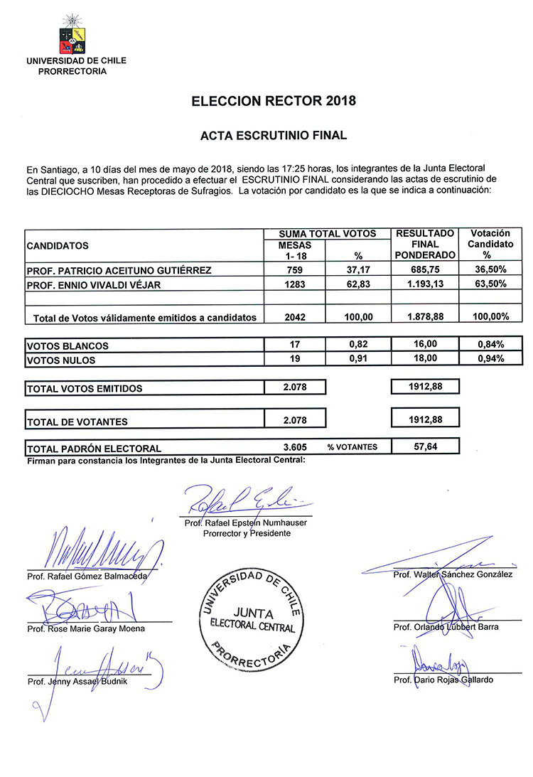 En Santiago, a 10 días del mes de mayo de 2018, los integrantes de la Junta Electoral Central han procedido a efectuar el escrutinio final considerando las actas de escrutinio de las dieciocho mesas receptoras de sufragios.