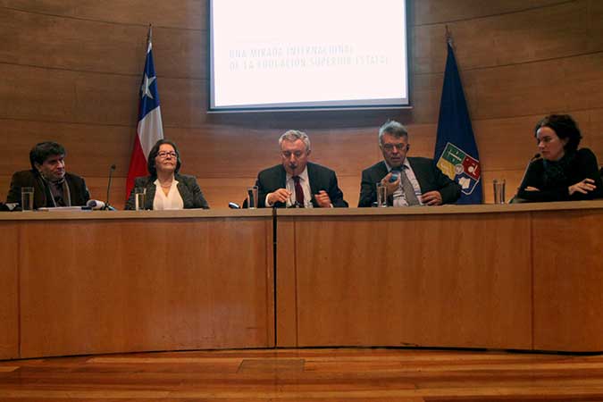 Participaron de esta quinta sesión del Seminario Permanente el Rector de la U. de Chile, Ennio Vivaldi; y los académicos Nolfa Ibáñez, directora del Doctorado en Educación de la Universidad Metropolitana de Ciencias de la Educación (UMCE) e integrante del Observatorio de la Educación Superior del CUECh, y Ernesto Águila, director del Departamento de Estudios Pedagógicos de la Facultad de Filosofía y Humanidades de la U. de Chile, quienes estuvieron a cargo de comentar la ponencia del académico francés.