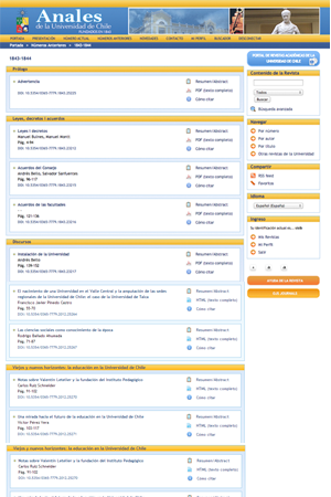 El sitio web de Anales de la Universidad de Chile permite realizar búsquedas por título, autor, resumen y texto completo, y navegar los números anteriores por autor, título y fecha de publicación, teniendo cada artículo un número único de identificación internacional.
