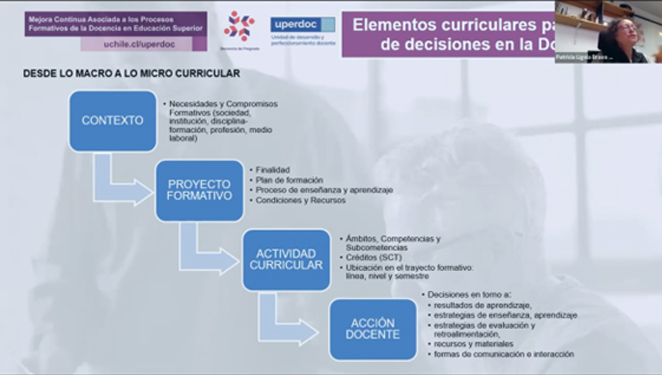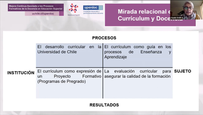 Al inicio de la exposición, Claudia Smith realizó la reflexión de la mirada relacional entre curriculum y docencia. Curriculum como un proceso de construcción, negociación o selección de saberes, identidades, realizaciones profesionales y disciplinares que se expresan en este conjunto de saberes y competencias, que están intencionadas, significadas y organizadas en un itinerario de formación, y que se orientan al logro de un perfil de egreso.
