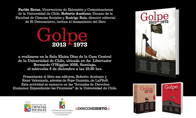 En el marco de las “Jornadas de Derechos Humanos: Expandiendo las Fronteras” de la Universidad de Chile, se realizará el lanzamiento del libro “Golpe 2013 1973”. Presentarán la investigación sus editores Roberto Aceituno, Decano de la Facultad de Ciencias Sociales, y René Valenzuela, además de Pepe Guzmán, del Laboratorio Transdisciplinar en Prácticas Sociales (LaPSoS).