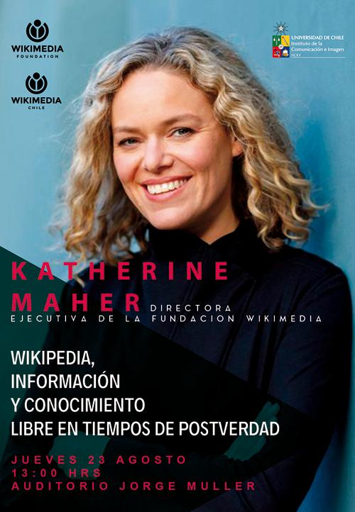 (Ignacio Carrera Pinto 1045 - Ñuñoa)Con el objetivo de analizar las múltiples relaciones y tensiones entre las comunidades, cultura y tecnología abiertas, el jueves 23 de agosto se realizará la charla "Wikimedia, información y conocimiento libre en tiempos de postverdad", donde expondrá Katherine Maher, directora ejecutiva de la Fundación Wikimedia.
