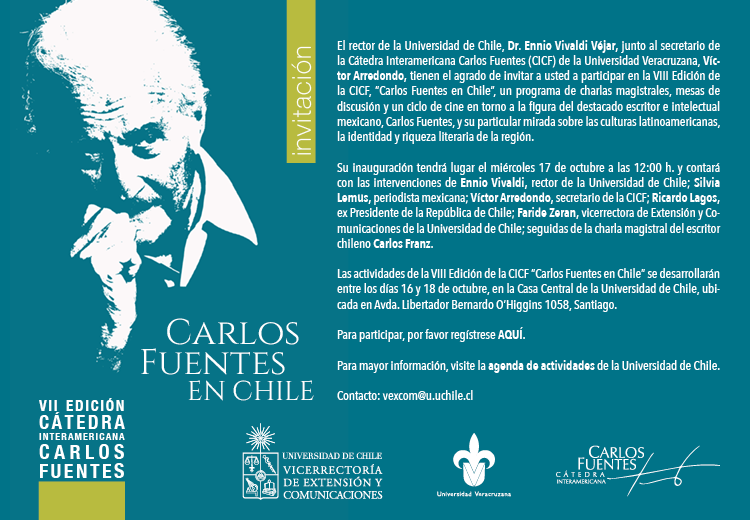 (Avenida Libertador Bernardo O'Higgins 1058, Santiago)La VIII Edición de la Cátedra Interamericana Carlos Fuentes (CICF), “Carlos Fuentes en Chile”, ofrece un amplio programa de charlas magistrales, mesas de discusión y un ciclo de cine en torno a la figura del destacado escritor e intelectual mexicano, Carlos Fuentes, y su particular mirada sobre las culturas latinoamericanas, la identidad y riqueza literaria de la región.