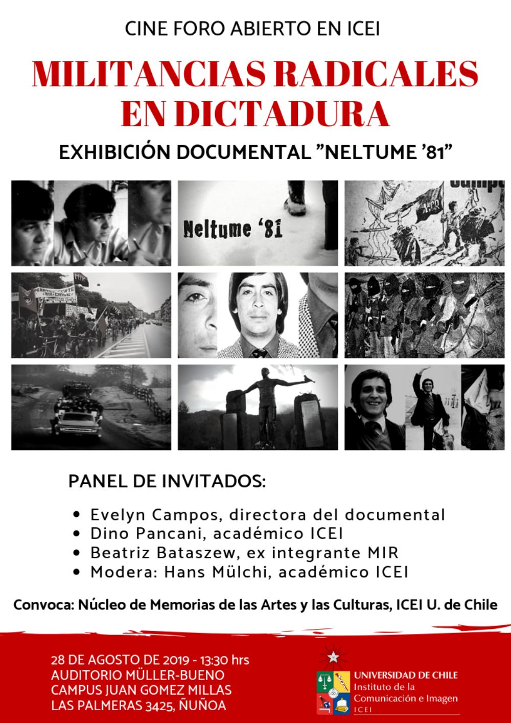 El próximo miércoles 28 de agosto, a las 13:30 horas, se exhibirá en el ICEI el documental Neltume 81. Esta actividad se realiza en el marco de los propósitos del Núcleo de Memorias de las Artes y las Culturas, ICEI, U de Chile y en este caso se quiere relevar las memorias de una militancia política en Dictadura y, por otra parte, reconocer el trabajo realizado por ex estudiantes del ICEI.