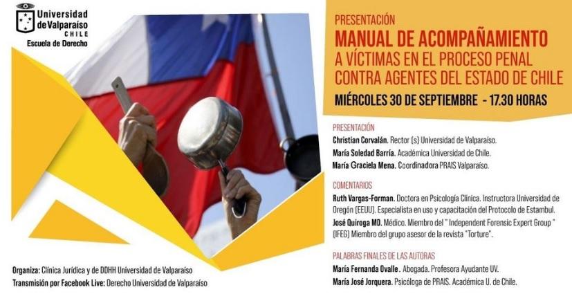 (https://www.facebook.com/events/1393418241049519)Este miércoles 30 de septiembre se presentará el "Manual de acompañamiento a víctimas en el proceso penal contra agentes del estado de Chile”, elaborado por la clínica jurídica y de derechos humanos de la Escuela de Derecho de la Universidad de Valparaíso, con la colaboración del Departamento de Atención Primaria y Salud Familiar de la Universidad de Chile.