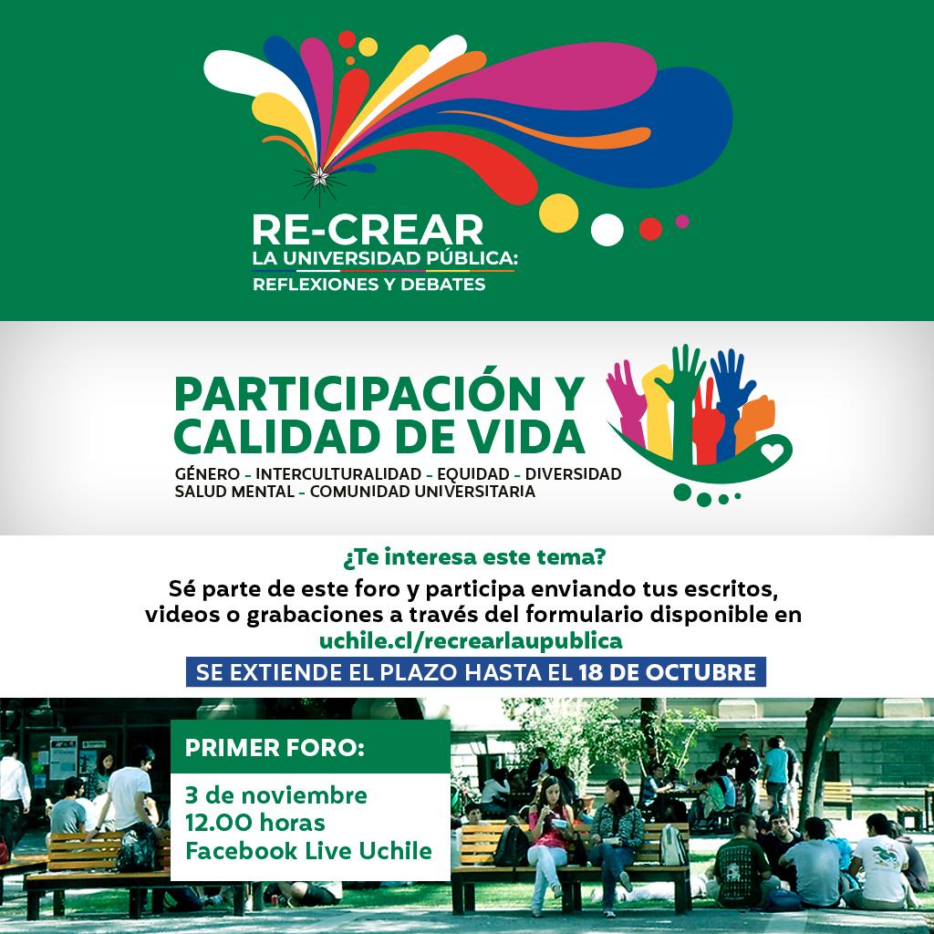(https://www.facebook.com/uchile)El ciclo de foros triestamentales "Re-crear la universidad pública: reflexiones y debates" comienza el martes 3 de noviembre de 2020 con el foro Participación y calidad de vida, cuyo objetivo es visibilizar y orientar el desafío técnico/político de construir un nuevo paradigma de participación inclusiva con perspectiva de género, equidad y diversidades e intercultural, como elementos indispensables de la calidad de vida para la diversidad y salud mental de la comunidad universitaria.
