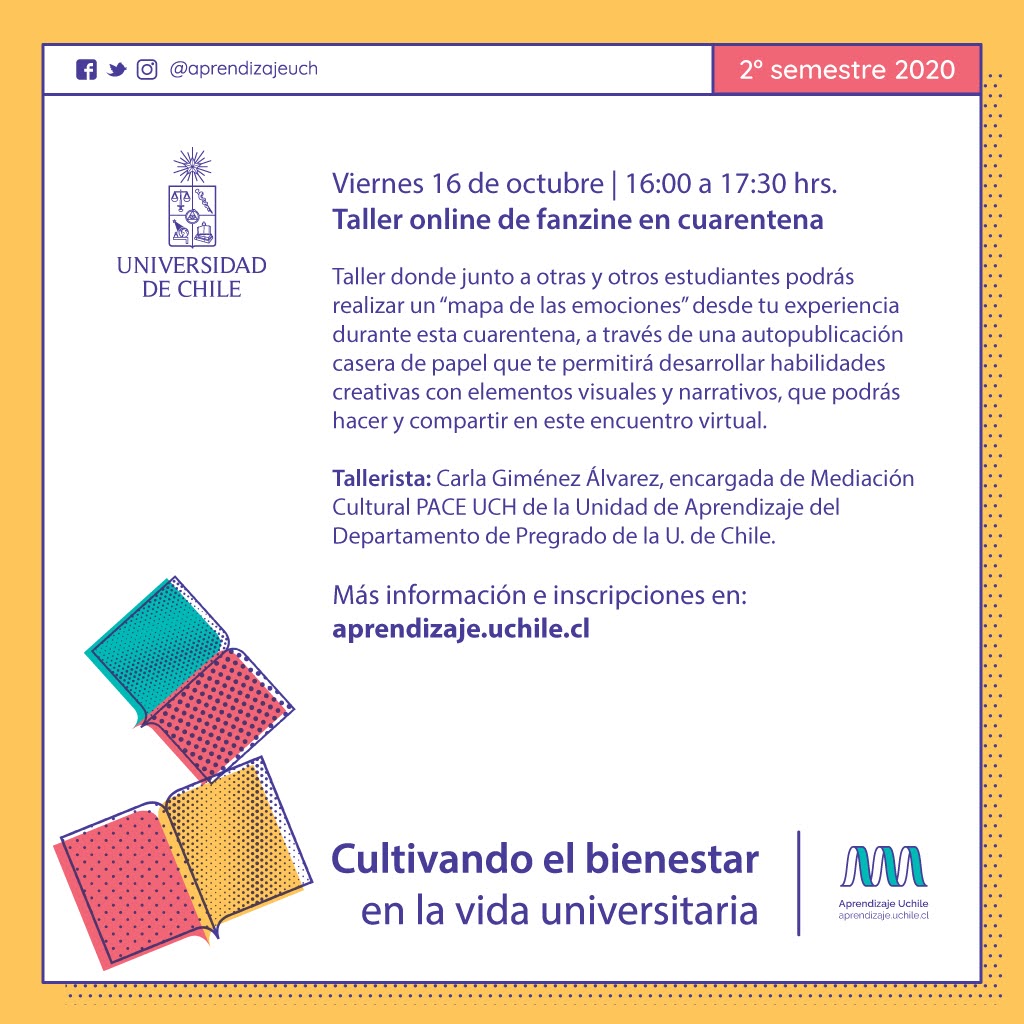 (Zoom - se entregará a las y los inscritos)En el marco del ciclo de talleres para estudiantes de la Universidad de Chile “Cultivando el bienestar en la vida universitaria” del Departamento de Pregrado, en el “Taller online de fanzine en cuarentena”, las y los estudiantes podrán realizar un “mapa de las emociones” desde su experiencia durante esta cuarentena, a través de una autopublicación casera de papel que les permitirá desarrollar habilidades creativas con elementos visuales y narrativos, que podrán hacer y compartir en este encuentro virtual.
