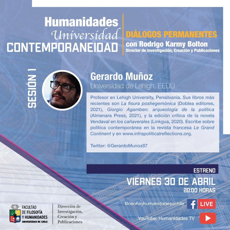 (Facebook Live)El pimer invitado del ciclo será Gerardo Muñoz de la Universidad de Lehigh, Estados Unidos. Sus libros más recientes son La fisura poshegemónica (Doblea editores, 2021), Giorgio Agamben: arqueología de la política (Almenara Press, 2021), y la edición crítica de la novela Vendaval en los cañaverales (Linkgua, 2020). Escribe sobre política contemporánea en la revista francesa Le Grand Continent y en www.infrapoliticalreflections.org.