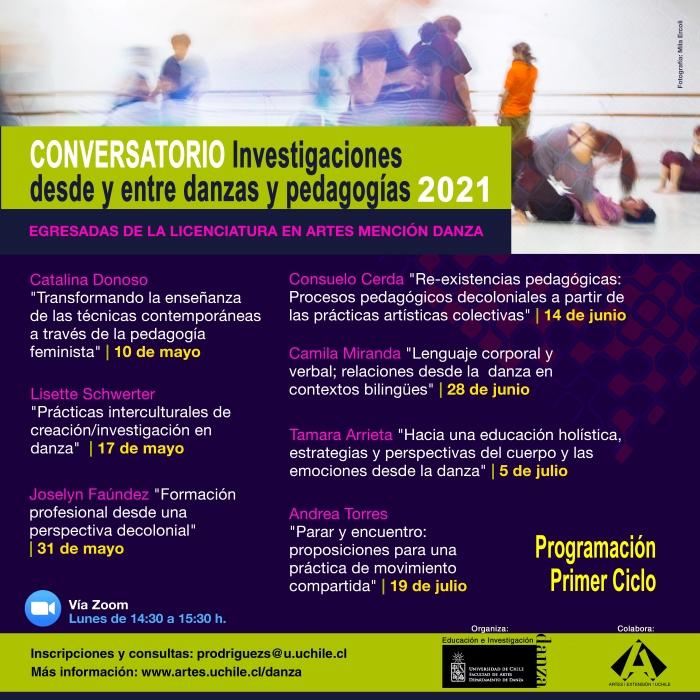(Online)El primer Ciclo de Conversatorios "Investigación desde y entre danza y pedagogías" que organiza el Departamento de Danza de la Facultad de Artes de la U. de Chile tiene como objetivos dar a conocer las investigaciones de postítulo, magíster y doctorado de las egresadas de la Licenciatura en Danza, vincular a las egresadas con la Especialidad de educación de Depto de Danza y la comunidad en general. Además busca promover saberes investigativos en relación a las prácticas artísticas pedagógicas para precisamente propiciar instancias de discusión desde y entre los ámbitos de la danza, la pedagogía y la investigación.