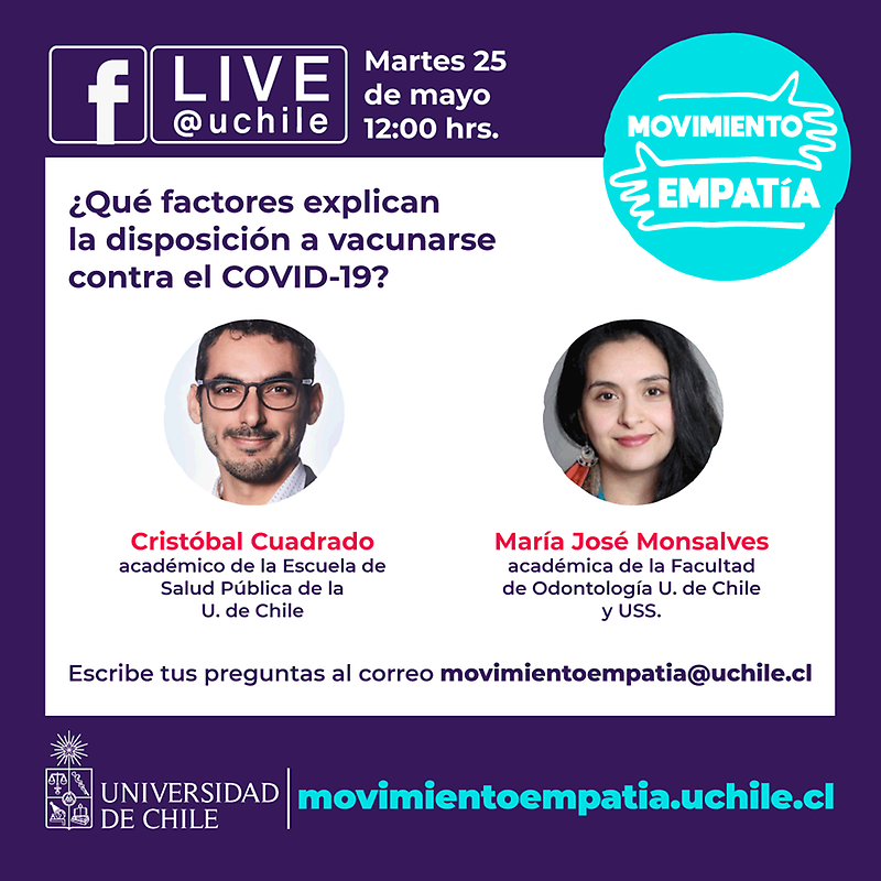 (https://www.facebook.com/uchile)Como parte de los espacios informativos del Movimiento Empatía -campaña mediante la cual la U. de Chile busca articular a la sociedad en su conjunto a abordar la pandemia con un enfoque comunitario en el ámbito de la salud, la vacunación y al cuidado como rol social- cada martes un grupo de expertos y expertos de la institución estarán conversando sobre un ámbito de la actualidad.