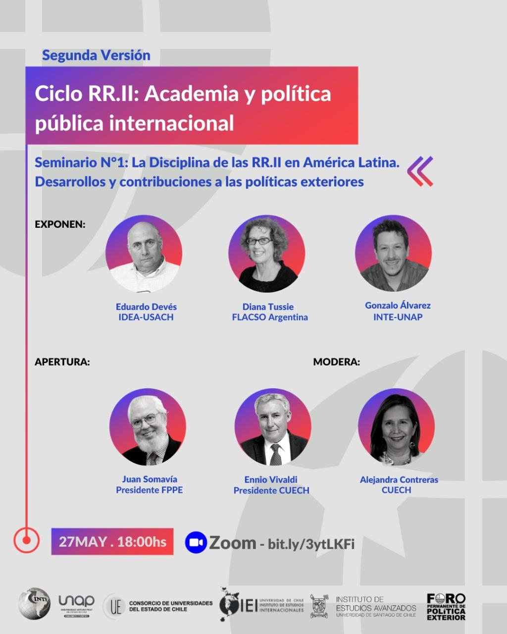 (Vía Zoom)En el marco del "Ciclo de Relaciones Internacionales: academia y política pública internacional", el INTE de la Universidad Arturo Prat, el Consorcio de Universidades del Estado de Chile (CUECH), el Instituto de Estudios Internacionales de la Universidad de Chile, el Instituto de Estudios Avanzados de la Universidad de Santiago y el Foro Permanente de Política Exterior, organizan el seminario "La disciplina de las RR.II. en América Latina. Desarrollos y contribuciones a las políticas exteriores".