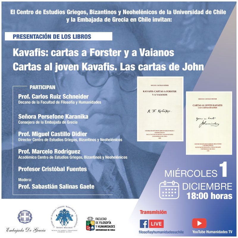 (Enlace en el texto)El Centro de Estudios Griegos, Bizantinos y Neohelénicos y la Embajada de Grecia en Chile invitan a la presentación de los libros Kavafis: cartas a Forster y a Vaianos y Cartas al joven Kavafis. Las cartas de John.