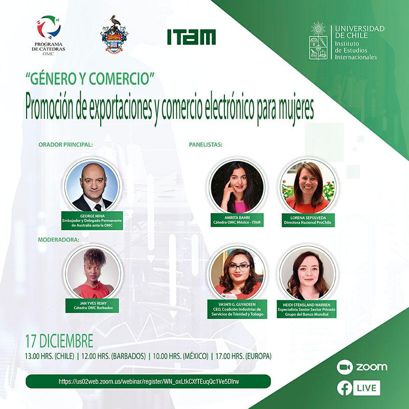 (Vía Zoom)En el marco del ciclo de seminarios sobre "Género y Comercio", que organizan los programas de Cátedras OMC de Chile, México y Barbados, se realizará la última sesión para abordar el tema "Promoción de exportaciones y comercio electrónico para mujeres".