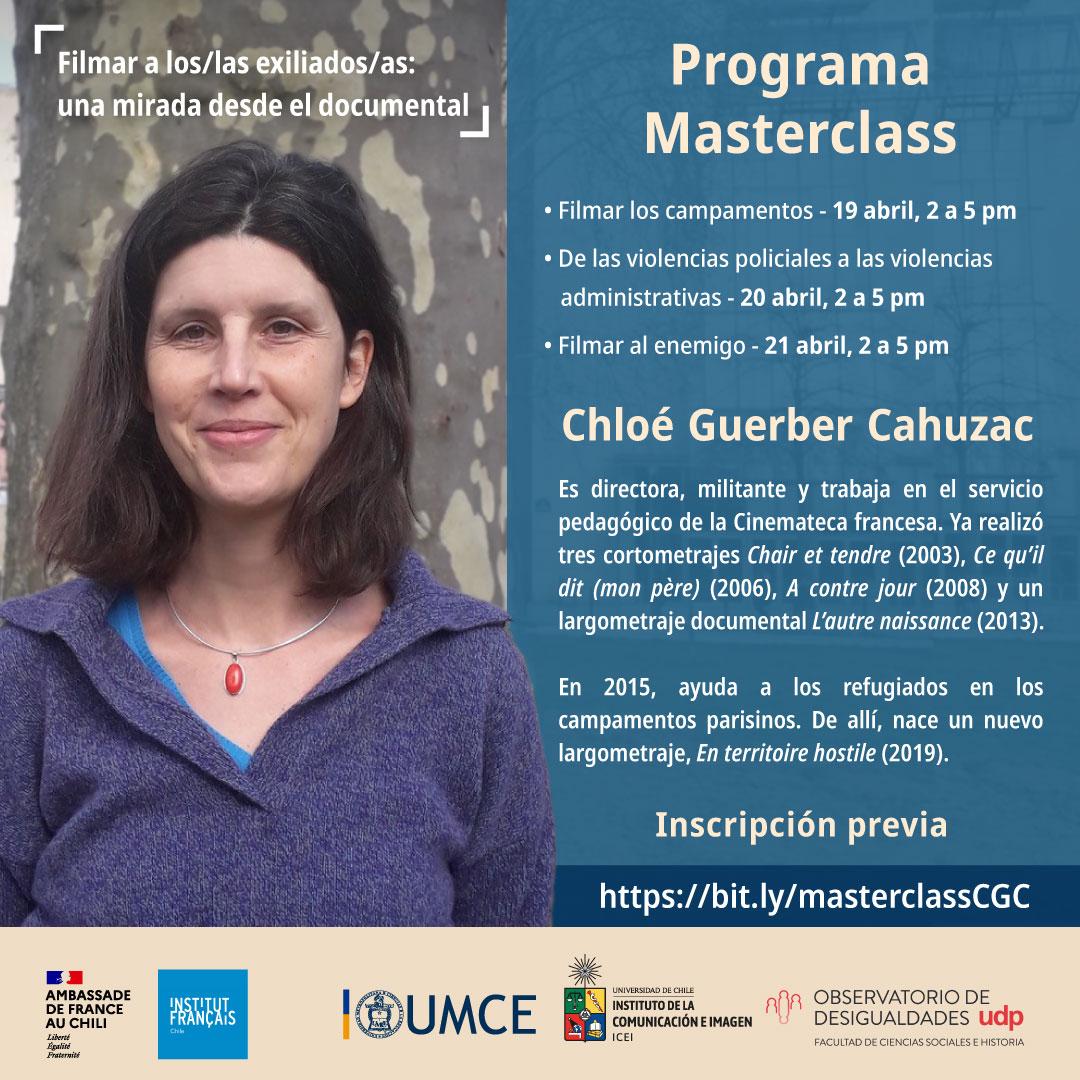 (UMCE)La Embajada de Francia en Chile y el Instituto Chileno Francés invitan a la comunidad al ciclo de cine "Migrantes" y la clase magistral de cine documental “Filmar a los/las exiliados/as: miradas documentales”, con la directora francesa Chloé Guerber-Cahuzac.