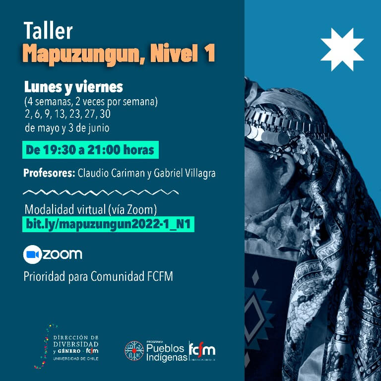 (Zoom)El Programa de Pueblos Indígenas DDG FCFM tiene el agrado de invitarles al Taller de Mapuzungun (Nivel 1), el cual se dictará los lunes y viernes, entre el 2 de mayo y 27 de mayo de 2022 (8 sesiones; semana del 16 de mayo es receso), de 19:30 a 21:00 hrs. en modalidad virtual vía Zoom.