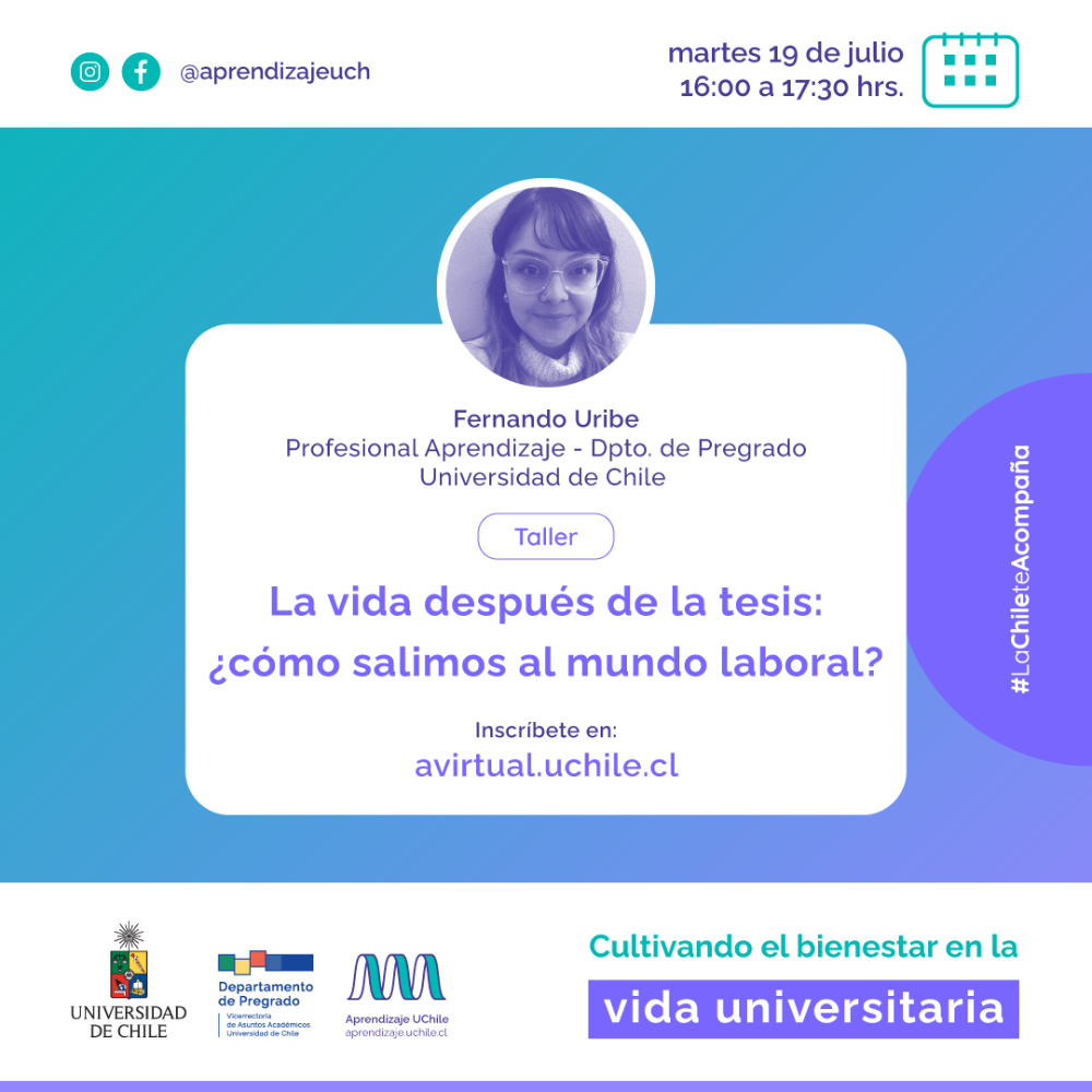 (El enlace se enviará a quienes se inscriban)En el marco del tercer ciclo de talleres para estudiantes, "Cultivando el bienestar en la vida universitaria", dirigido a todas y todos los estudiantes de pregrado de la Universidad de Chile, el taller “La vida después de la tesis: ¿cómo salimos al mundo laboral?” busca que sus participantes tengan la oportunidad de reflexionar respecto a sus herramientas para comenzar a planificar la salida al mundo laboral y compartir reflexiones y experiencias sobre el futuro una vez egresados. Además, en el taller se revisarán algunos lineamientos para preparar un currículum vitae y orientaciones para enfrentar una entrevista de trabajo.