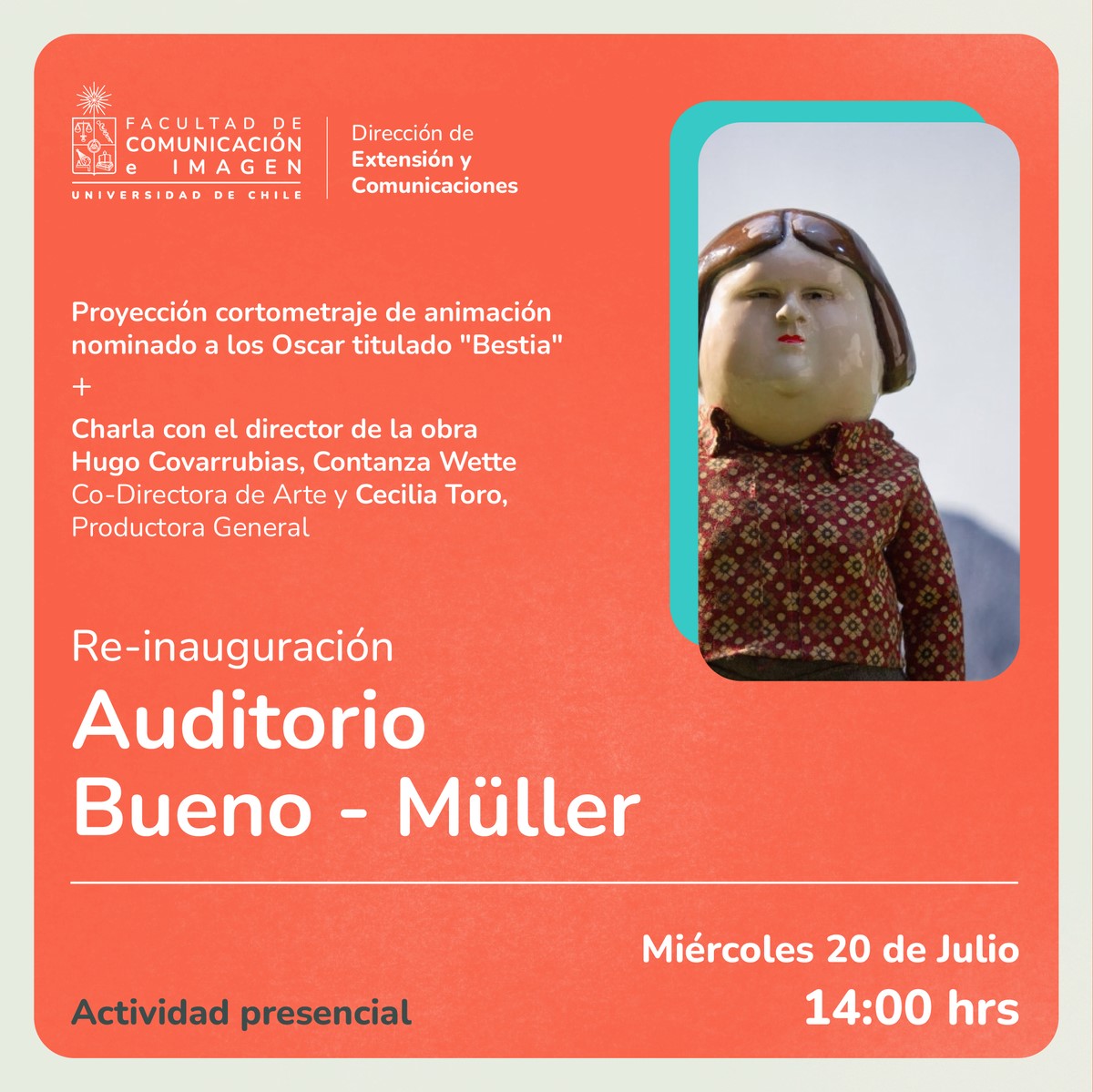 La Dirección de Extensión y Comunicaciones de la Facultad de Comunicación e Imagen de la Universidad de Chile invitan a su comunidad a la Re-inauguración del Auditorio Bueno - Muller. En el evento, que se llevará a cabo el miércoles 20 de Julio a las 14 horas, se proyectará el cortometraje, nominado a los Premios Oscar 2022, Bestia (15´, 2021). La película animada está inspirada en la figura de Ingrid Olderöck, ex agente de la Dirección Nacional de Inteligencia de Chile (DINA)