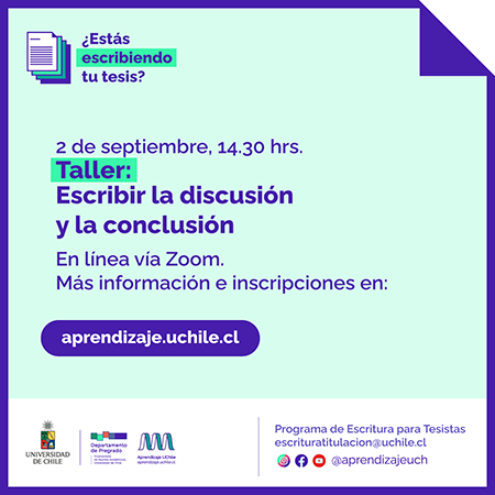 (Zoom, se le enviará la dirección a quienes se inscriban)En el marco del Programa de Escritura para Tesistas de la Unidad de Aprendizaje del Departamento de Pregrado, el taller “Escribir la discusión y la conclusión” busca entregar estrategias transversales para desarrollar la discusión y conclusión de la tesis. En esta instancia se profundiza en los elementos que componen ambas secciones, algunas herramientas para identificar en qué se distinguen la discusión y la conclusión de la sección de resultados, además de sugerencias para organizar su estructura.