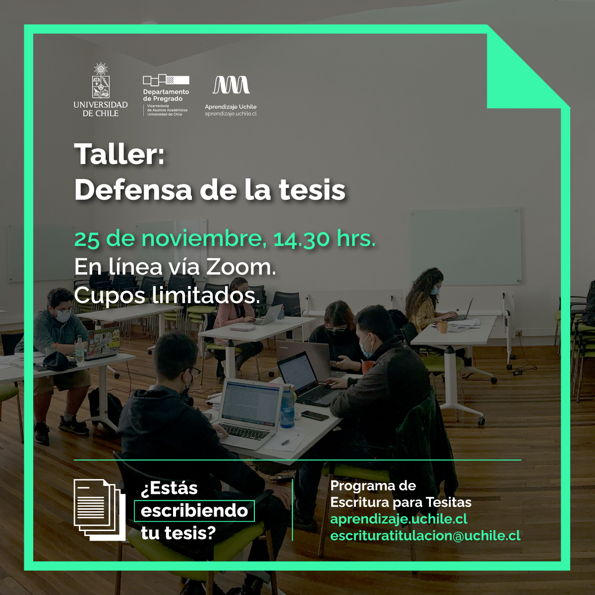 (Zoom, se le enviará la dirección a quienes se inscriban)En el marco del Programa de Escritura para Tesistas de la Unidad de Aprendizaje del Departamento de Pregrado, el taller “Defensa de la tesis” busca entregar estrategias para enfrentar la defensa de tesis. En esta instancia se abordan aspectos como la construcción del guion, sugerencias para diseñar el material audiovisual y manejar la ansiedad ante este desafío.