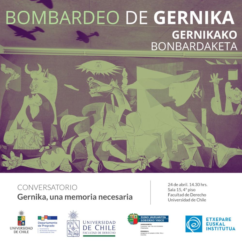 (Pío Nono 1, Providencia, Santiago)El Departamento de Pregrado de la Vicerrectoría de Asuntos Académicos de la Universidad de Chile a través del CFG “Euskera y Cultura Vasca”, la Facultad de Derecho de la Universidad de Chile, la Delegación del País Vasco en Chile, Perú y Colombia y el Instituto Vasco Etxepare, tienen el agrado de invitarle al conversatorio “Gernika, una memoria necesaria”, en el marco de los actos de conmemoración del 87º aniversario del Bombardeo de Gernika, hecho histórico ocurrido el 26 de abril de 1937. Este encuentro busca transitar y reflexionar en torno a la memoria y a la construcción y el fortalecimiento de la paz.