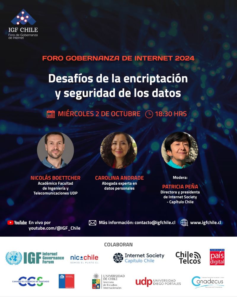 (https://www.youtube.com/watch?v=eFtqXp0tRzs)El 2 de octubre a las 18:30 horas (GMT -3), el Foro de Gobernanza de Internet en Chile realizará su webinar sobre la encriptación y seguridad de los datos.