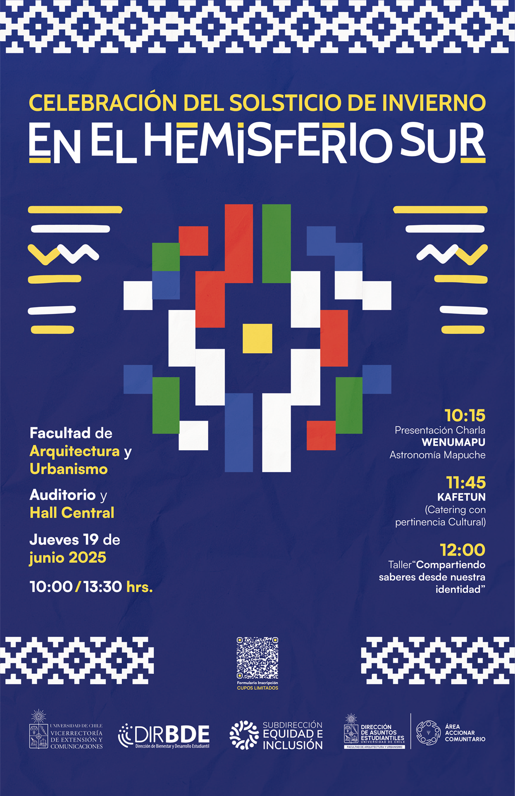 (Portugal 84, Santiago Centro. )La Subdirección de Equidad e Inclusión, la Vicerrectoría de Extensión y Comunicaciones, y el Área de Accionar Comunitario de la Facultad de Arquitectura y Urbanisno invitan a la comunidad Uchile a la Celebración del Solsticio de Invierno en el Hemisferio Sur, instancia que busca festejar y poner en valor los saberes ancestrales de los pueblos americanos.