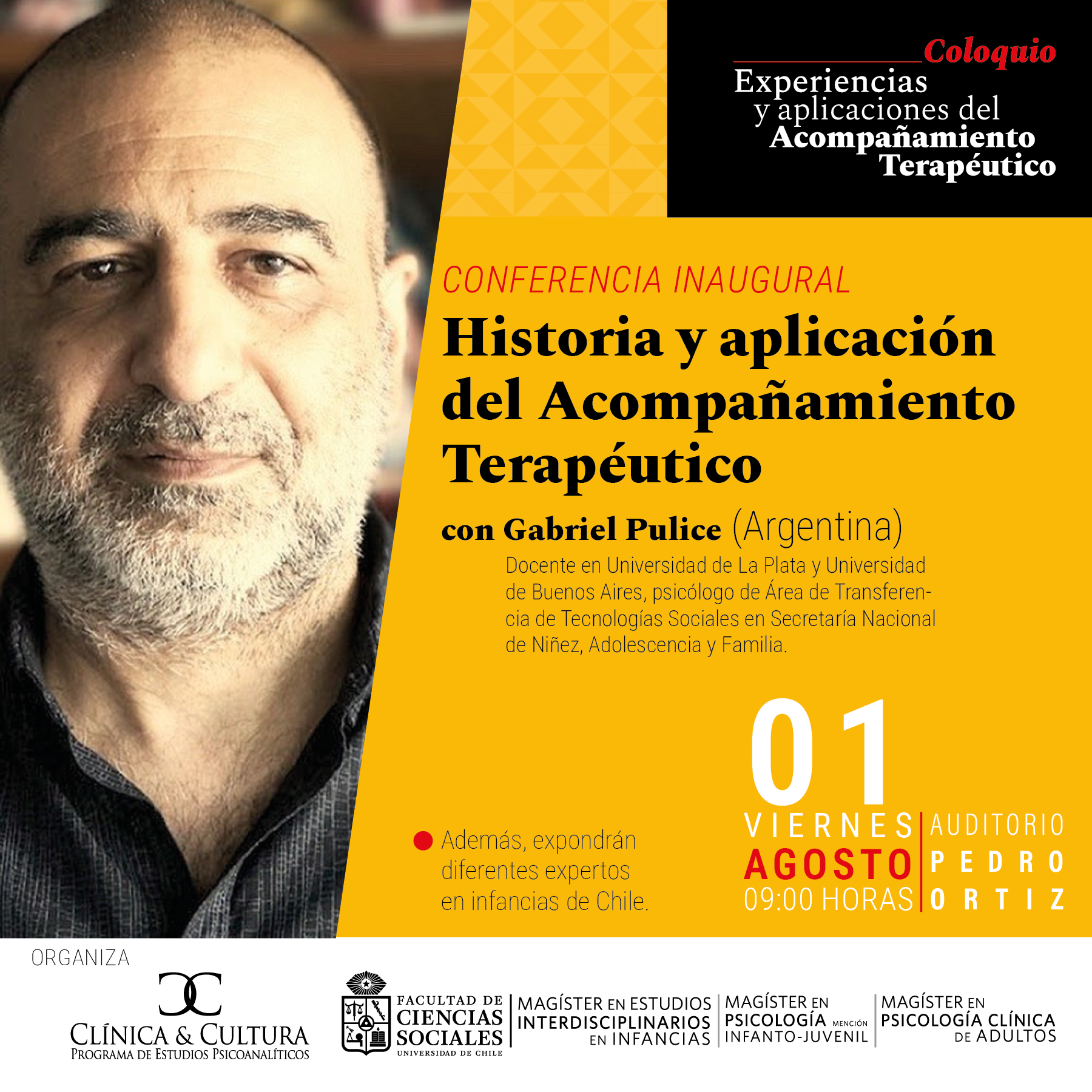 El 01 de agosto a las 09.00 horas en el Auditorio Pedro Ortiz se realizará la Conferencia inaugural “Historia y aplicación del Acompañamiento Terapéutico” con Gabriel Pulice (Argentina) , docente de la Universidad de La Plata y de la Universidad de Buenos Aires. Dicha conferencia se inserta dentro del Coloquio "Experiencias y aplicaciones del Acompañamiento Terapéutico".