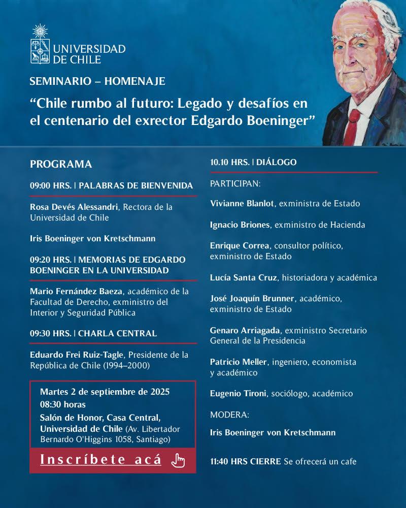 Rosa Devés Alessadri, Rectora de la Universidad de Chile, junto a Iris Boeninger von Kretschmann, tienen el agrado de invitarle al seminario-homenaje “Chile rumbo al futuro: Legado y desafíos en el centenario del exrector Edgardo Boeninger”, que se realizará el martes 2 de septiembre de 2025, a las 08:30 horas, en el Salón de Honor de la Universidad de Chile (Av. Libertador Bernardo O'Higgins 1058, Santiago).