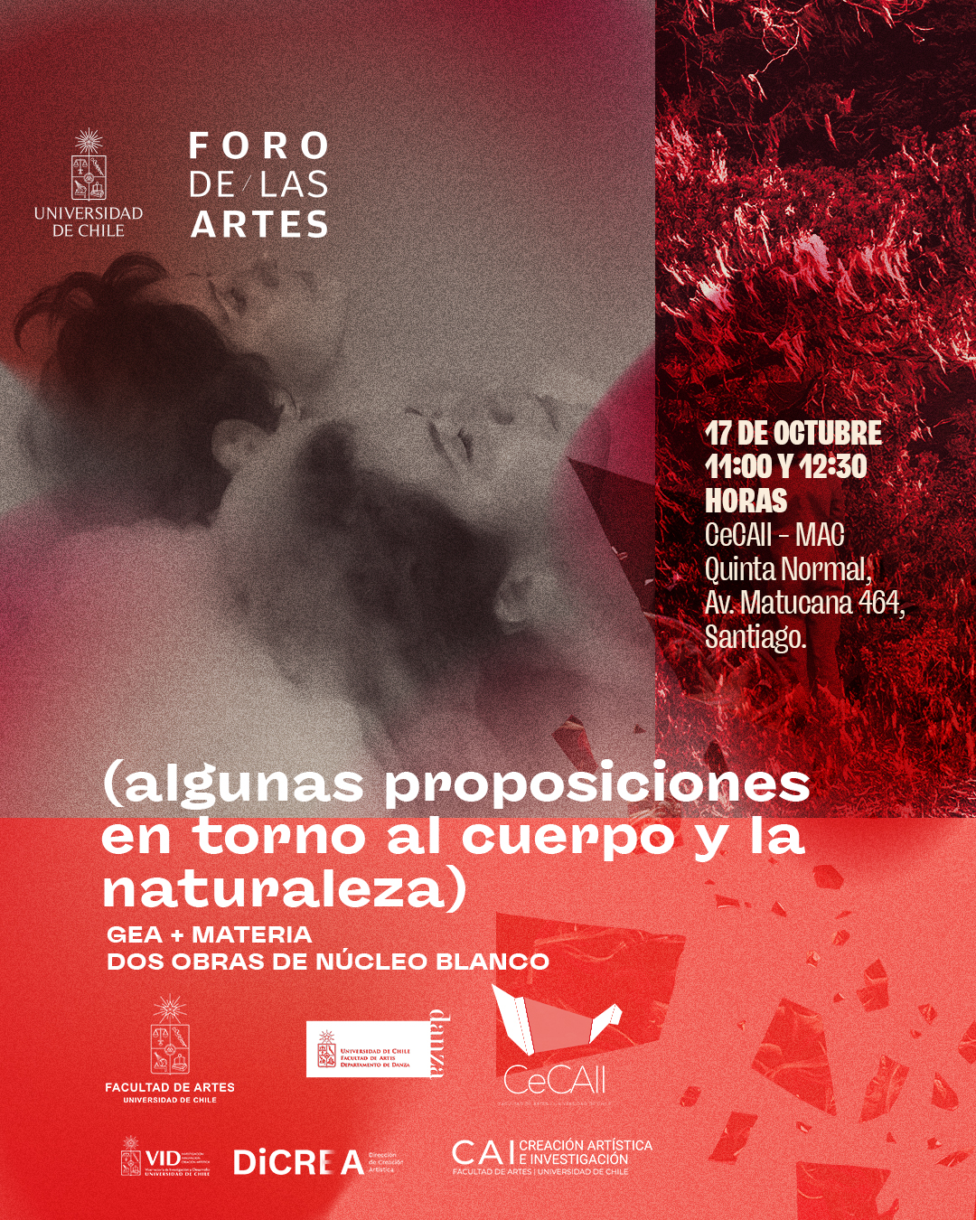 (Av. Matucana 464, Santiago)Núcleo Blanco presenta “(algunas proposiciones en torno al cuerpo y la naturaleza)”, una actividad que reúne dos de sus creaciones más recientes: GEA y MATERIA. Ambas obras dialogan desde lenguajes distintos acerca de la interdependencia entre lo humano y lo natural, invitando a habitar un territorio donde los límites entre cuerpo y entorno se difuminan.