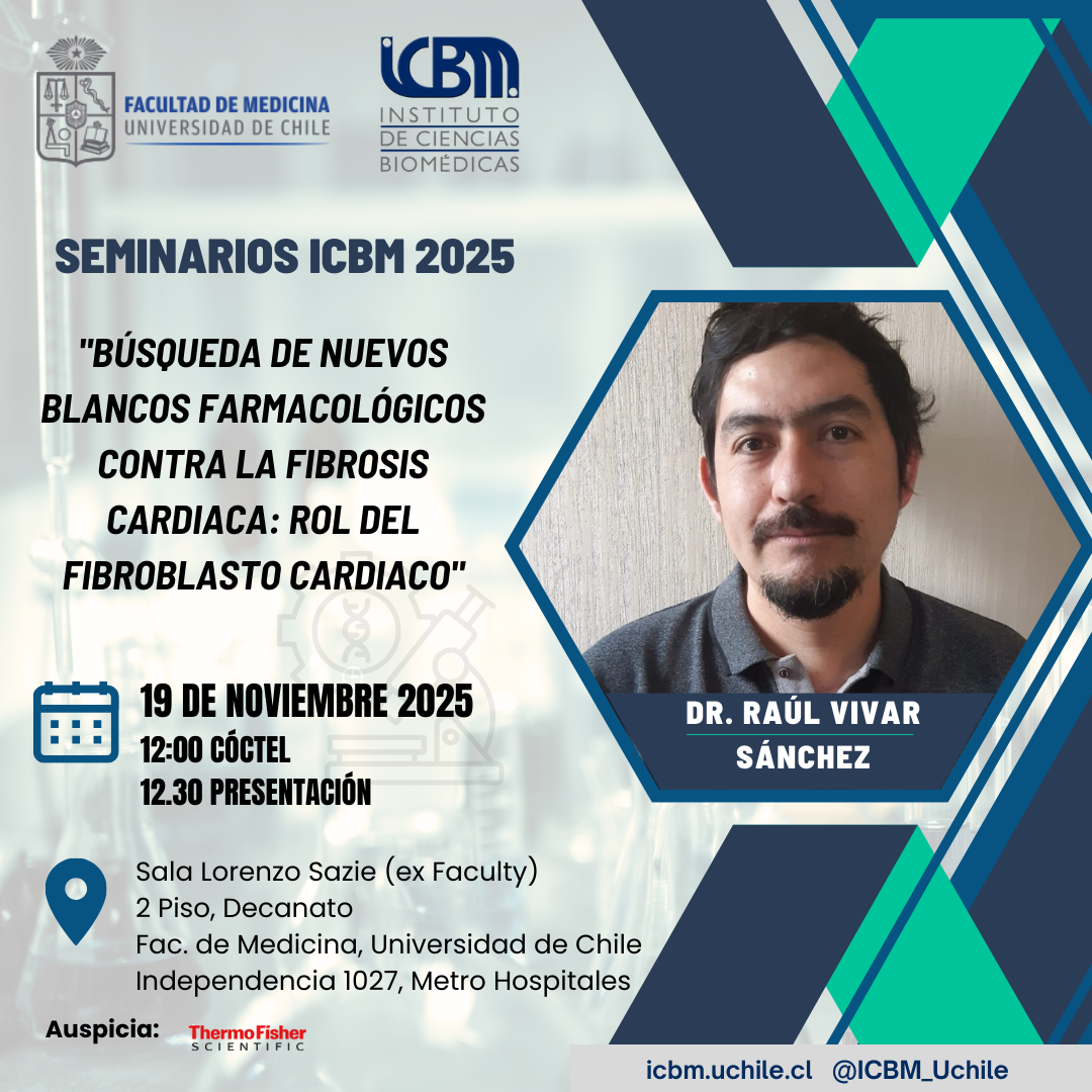 (Independencia 1027, Santiago, Chile)Las y los invitamos a nuestros seminarios ICBM 2025 el próximo miércoles 19 de noviembre a las 12h en la Sala Lorenzo Sazie (ex Faculty) ubicada en el 2° piso, en el Decanato de la Facultad de Medicina.
