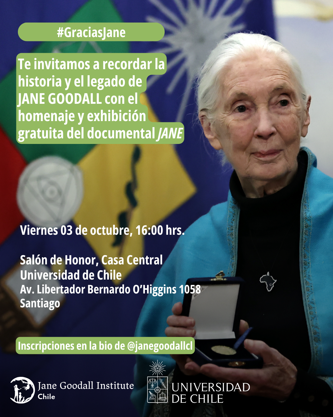 (Av. Bernardo O'Higgins 1058, Santiago, Santiago, Chile)Tras el reciente fallecimiento de la notable científica Jane Goodall, este viernes 3 de octubre a las 16:00 horas, podrás ver de forma gratuita el documental JANE en el salón de honor de la Casa Central de la Universidad de Chile, mismo lugar donde esta destacada científica también recibió la distinción Doctor Honoris Causa del plantel en una inspiradora e histórica jornada.