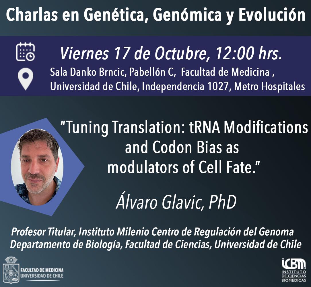 (Av. Independencia 1027, Independencia, Santiago de Chile)El Núcleo Interdisciplinario de Biología y Genética invita a la charla del ciclo Genética, Genómica y Evolución: “Tuning Translation: tRNA Modifications and Codon Bias as modulators of Cell Fate”, dictada por el Dr. Álvaro Glavic en la Sala Danko Brncic, Pabellón C, 1er piso, Facultad de Medicina Norte.