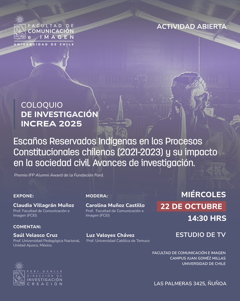 La Dirección de Investigación Creación de la Facultad de Comunicación e Imagen, las y los invitan al Coloquio de Investigación Creación 2025, titulado Escaños Reservados Indígenas en los Procesos Constitucionales chilenos (2021-2023) y su impacto en la