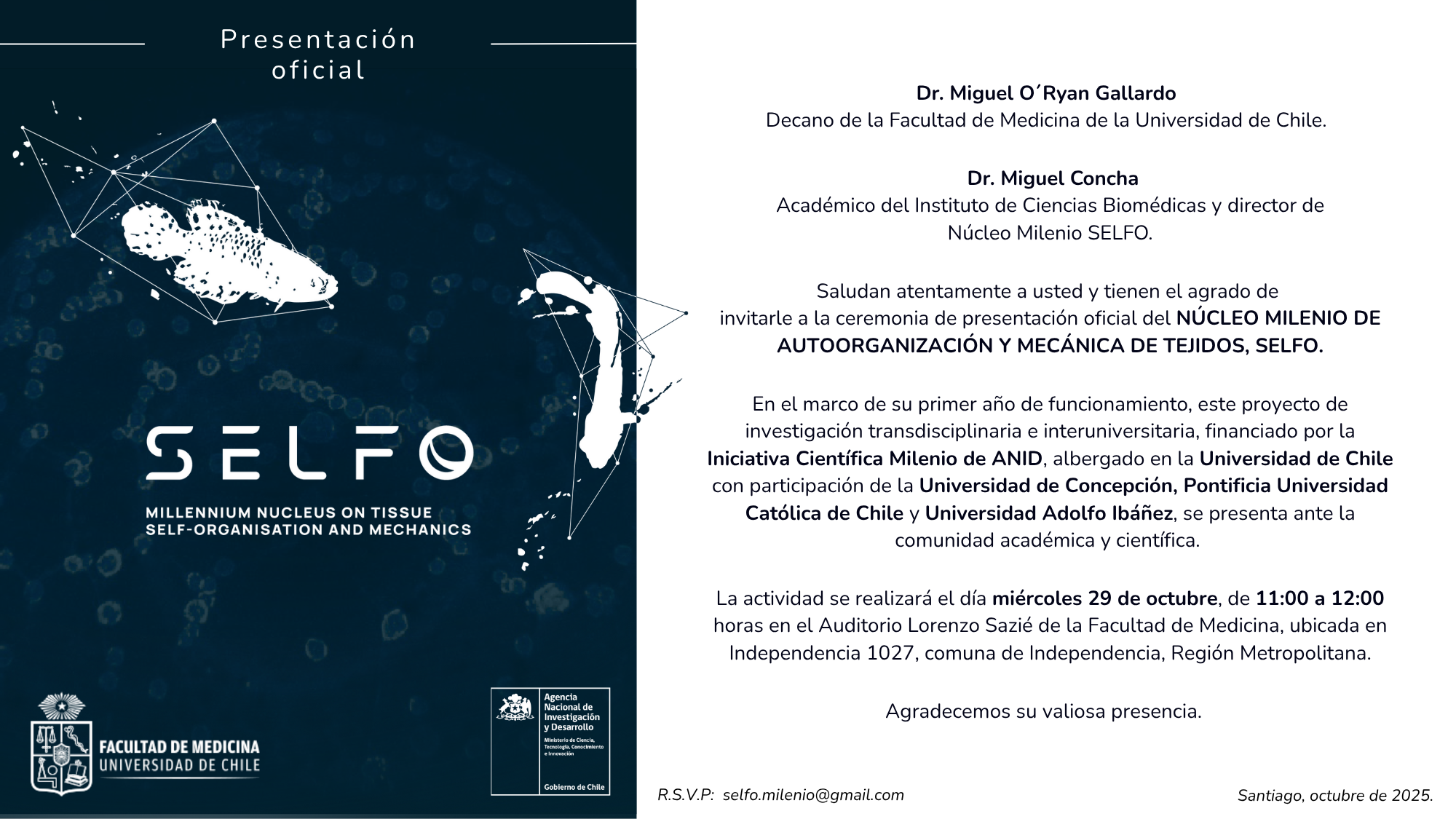 El Núcleo SELFO está dirigido por el Dr. Miguel Concha, académico del Instituto de Ciencias Biomédicas (ICBM), y constituye un espacio de investigación transdisciplinaria e interuniversitaria que busca comprender los procesos de autoorganización celular y mecánica de tejidos, con un foco transdisciplinar que integra perspectivas de la biología, la física, la ingeniería y la computación.