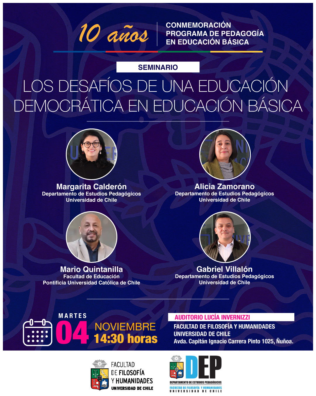 (Avda. Capitán Ignacio Carrera Pinto 1025, Ñuñoa)En el marco de la conmemoración de los 10 años del programa de Pedagogía en Educación Básica, la Facultad de Filosofía y Humanidades de la Universidad de Chile tiene el agrado de invitar al seminario “Los desafíos de una Educación Democrática”, instancia de reflexión y diálogo en torno al compromiso formativo, ético y social de la educación pública en el Chile actual.
